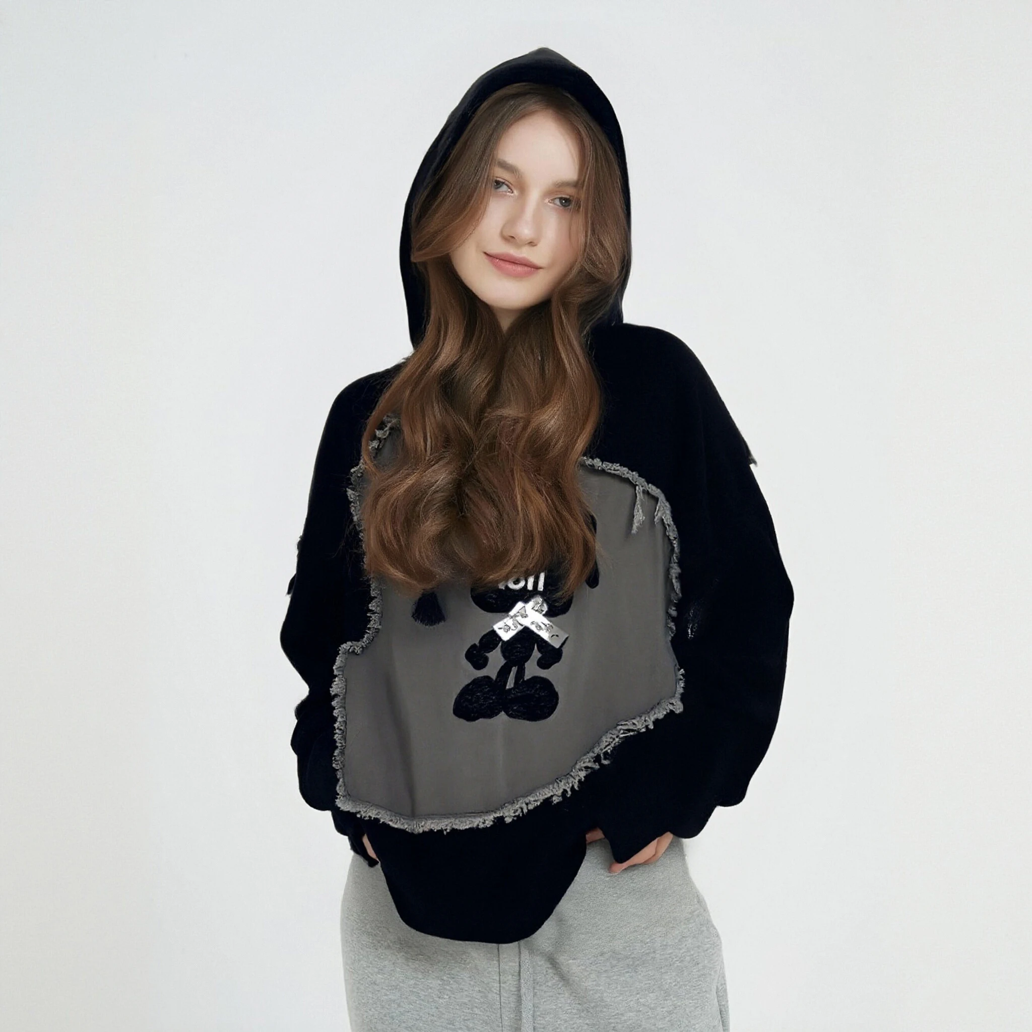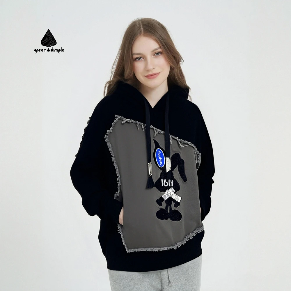 Custom Women Cartoon Patchwork Hoodie Frayed Edge Oversized Silhouette Fleece Fabric Street Daily Casual Sweatshirts